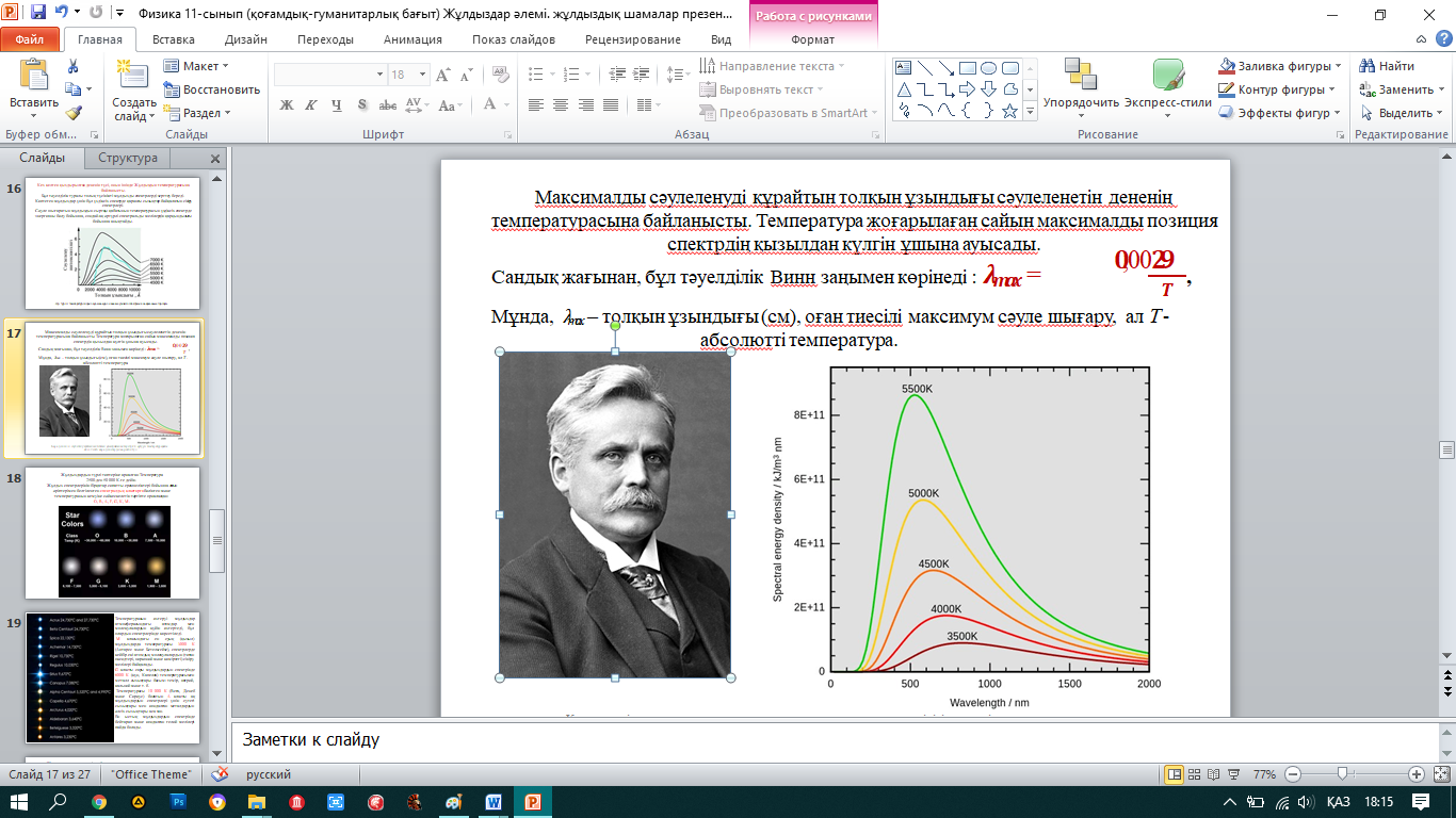 (W) жаңа материалды талдау Астрономдар жұлдыздың жарықтығы L - уақыт бірлігінде сәулеленетін толық энергияны білдіреді дейді. Әрине, бұл жағдайда жарықтық қашықтыққа байланысты емес. Күннің жарықтық өлшемі – 3.83*1026 Ваттқа жетеді. Жұлдыздың жарықтық өлшемін мына формуламен есептеуге болады: мұнда, R —жұлдыздың радиусы, T — оның бетінің температурасы, σ — Стефана-Больцман тұрақтысы. Астрономияда жұлдыздарды жарықтығы бойынша салыстыра отырып, олардың жарқылын (жұлдызды шама) бір стандартты қашықтық үшін есептеу қабылданған–10 пк. Жұлдыз ие болатын, көрінетін жұлдыз шамасы бізден D0=10 пк қашықтықта болған жағдайда М абсолютті жұлдызды шаманың атауын алды. Ғарыштағы өлшемдер алдамшы: Жерден алынған Денеб Антареске қарағанда қаттырақ жарқырайды, бірақ Пистолет мүлдем көрінбейді. Дегенмен, біздің планетамыздағы бақылаушыға Денеб пен Антарес Күнмен салыстырғанда, шамалы ғана болып көрінеді. Қаншалықты қате екенін мына қарапайым фактімен айтуға болады . Күн бір жылда қанша жарық шығарса, Тапанша дәл соны секундына шығарады! D жұлдызына (немесе параллакс – р) дейінгі қашықтықты және оның көрінетін жұлдызды М шамасын біле отырып, m абсолюттік жұлдызды шаманы қалай анықтауға болатынын қарастырайық. Жұлдызды шамалары m1 және m2 тең жұлдыз үшін, олардың жылтырлығының қатынасы I1 және I2 арақатынасымен анықталады: I1:I2=2,512m2-m1 Бір жұлдыздың көрінетін және абсолютті жұлдызды шамалары үшін : I:I0=2,512M-m Мұнда I0 – бұл D0 = 10 пк арақашықтығында орналасқан осы жұлдыздың жылтыры. Сонымен қатар жұлдыздың жарқырауы оған дейінгі қашықтық квадратына пропорционалды түрде өзгереді. I : I0 = D2 0 : D2 2,512M-m = D2 0 : D2. Логарифм арқылы өрнектесек: 0,4 ???? − ???? = lg102 − lg????2, немесе ???? = ???? + ???? − ???? ????g ????, немесе ???? = ???? + ???? + ????g ????. Күннің абсолютті жұлдызды шамасы М0= 5m, яғни 10 пк қашықтығынан біздің күн бесінші жұлдызды шаманың жұлдызы ретінде көрінеді. М жұлдызының абсолюттік жұлдызды шамасын біле отырып, оның L жарықтығын есептеу оңай. Күн сәулесін жарқырауын есептей отырып, біз мынаны аламыз: L = 1, L = 2,5125-M немесе lgL = 0,4 (5 – М). Жарық қуаты (сәуле шығару қуаты) бойынша Жұлдыздар бір-бірінен айтарлықтай ерекшеленеді: кейбіреулері энергияны күн сәулесінен бірнеше миллион есе артық, басқалары-жүздеген мың есе аз. Ең жоғары жарықтық жұлдыздардың абсолюттік жұлдызды шамалары (алыптар мен аса гиганттар) М = -9m жетеді. Ең аз жарық беретін жұлдыз-карликтер М = +17m абсолюттік жұлдызды шамаға ие Есеп шығару мысалы Көрінерлік жұлдыздық шамасы m=2 болатын жұлдыз 250 пк қашықтықта орналасқан. Осы жұлдыздың абсолютті жұлдызды шамасын анықтаңыз. Шешуі. Теңдеуден абсолютті жұлдыздық шаманы өрнектеп аламыз Жұлдыздардың спектрлері, түсі және температурасы Кез келген қыздырылған дененің түсі, оның ішінде Жұлдыздың температурасына байланысты. Бұл тәуелділік туралы толық түсінікті жұлдызды спектрлерді зерттеу береді. Көптеген жұлдыздар үшін бұл үздіксіз спектрде қараңғы сызықтар байқалатын сіңіру спектрлері. Сәуле шығаратын жұлдыздың сыртқы қабатының температурасын үздіксіз спектрде энергияны бөлу бойынша, сондай-ақ әртүрлі спектральды желілердің қарқындылығы бойынша анықтайды. Жұлдыздардың түрлі типтеріне арналған Температура 2500-ден 50 000 К-ге дейін. Жұлдыз спектрлерінің бірқатар сипатты ерекшеліктері бойынша латын әріптерімен белгіленген спектралдық кластарға бөлінген және температуран
