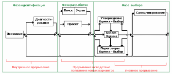Схема стадий принятия решений, обнаруженных Минцбергом и его коллегами, приведена на рис. .2. Каждый квадрат указывает на возможный шаг в последовательности принятия решений. Все шаги размещаются внутри трех основных фаз процесса: идентификации, разработки и выбора.